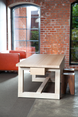 Die kubistische Form und seine einmalige Funktionalität zeichnen diesen Esstisch aus Eiche-Vollholz aus. Neben dem gekalkten Fußgestell besticht die Tischplatte durch ihre Vielseitigkeit.